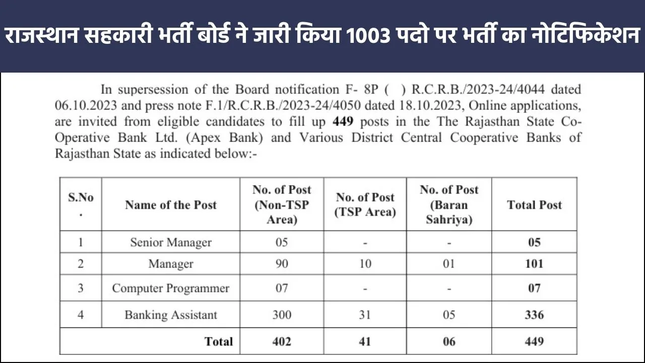 राजस्थान सहकारी भर्ती बोर्ड द्वारा यह विज्ञप्तियां विभिन्न पदों और विभिन्न विभागों में कुल 1003 पदों पर योग्य उम्मीदवारों के चयन हेतु जारी की गई है। इसमें कुल तीन विज्ञप्तियां जारी की गई है जिसमें से पहली विज्ञप्ति राजस्थान स्टेट कोऑपरेटिव मार्केटिंग फेडरेशन लिमिटेड (RAJFED) में 49 पदो पर दूसरी राजस्थान कोऑपरेटिव डेयरी फेडरेशन (RCDF) में 503 पदो पर और तीसरी राजस्थान स्टेट कोऑपरेटिव बैंक लिमिटेड (Apex Bank) मैं 449 पदो पर भर्ती निकाली गई है। जो भी उम्मीदवार इस भर्ती में भाग लेने की इच्छा रखते हैं वह 12 दिसंबर से ऑनलाइन आवेदन फॉर्म भर सकते हैं, साथ ही Rajasthan Cooperative Recruitment Board Vacancy 2024 से जुड़ी अधिक जानकारी हेतु इस पोस्ट को अंत तक पूरा पढ़े एवं नोटिफिकेशन डाउनलोड करने और ऑनलाइन फॉर्म भरने का लिंक नीचे उपलब्ध करवाया गया है।